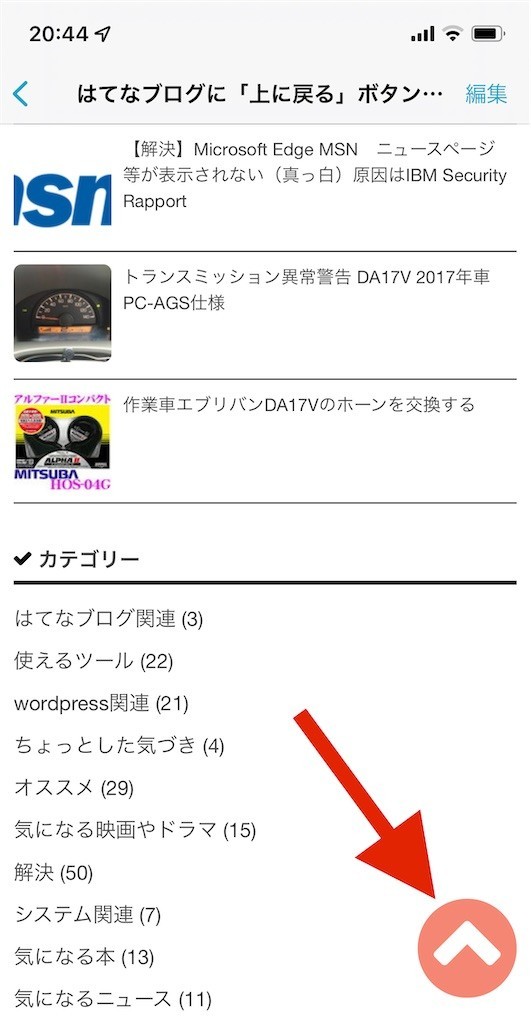 2022-06-04 [快適操作]はてなブログに「上に戻る」ボタンをコピペで簡単に設置する方法 はてなブログ関連 使えるツール 上に戻るボタンをつけてみました。今回は下記のサイトを確認して、その通りにやりました。 こちらのサイトは親切に書かれていますので、十分に適用することが出来ました。