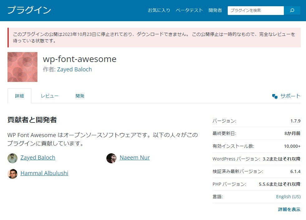 2023-10-27 [エラー解決]「WP font awesome」の公開停止により「Font Awesome」プラグイン導入 wordpress関連 解決 下記のサイトにあるように、2023年10月23日にて公開が停止になりました。今後の更新などは無くなります。JetPack Protectのページにもアラートがずっと表示されていましたが、今回新しく「Font Awesome」プラグインを導入することとしました。 「Font Awesome」プラグインの導入 既存のプラグイン「WP Font Awesome」を削除する前に、「Font Awesome」プラグインを導入した。どこに何のアイコンを入れたのか分かりやすくするために、すぐに削除はしません。 導入方法は下記のサイト参考としました。